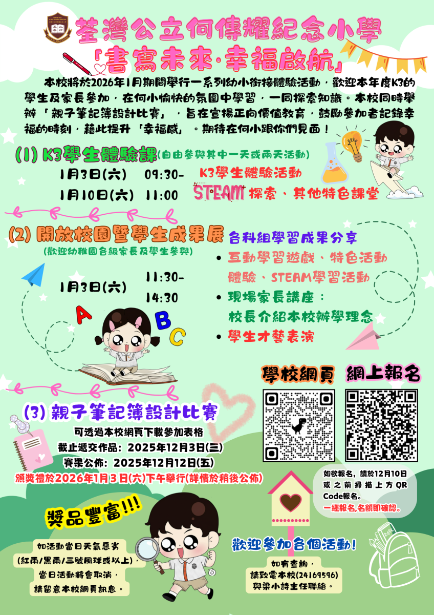本校將於2026年1月期間舉行一系列「書寫未來‧幸福啟航」幼小銜接體驗活動,歡迎本年度K3的學生及家長參加。期望學童能在何小愉快的氛圍中學習,一同探索知識,獲得啟發。